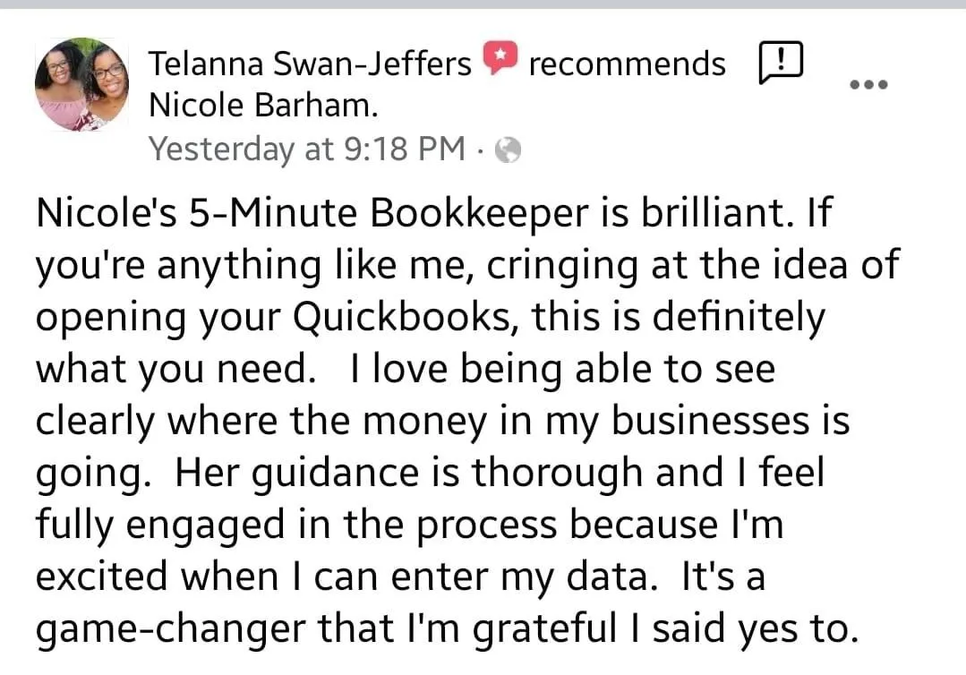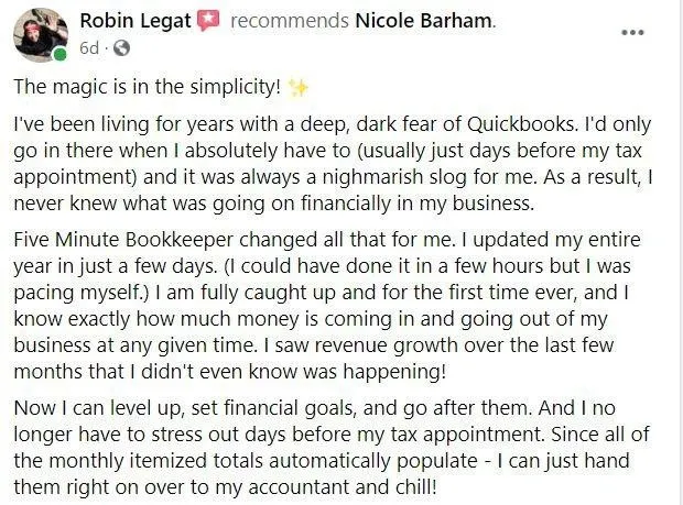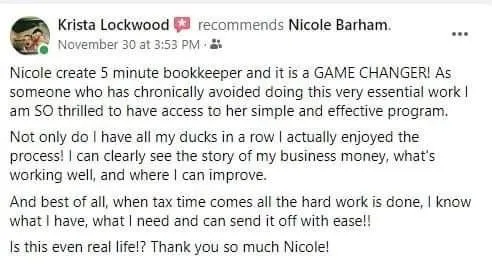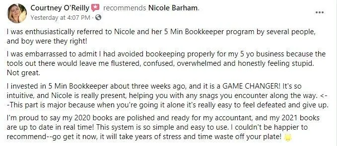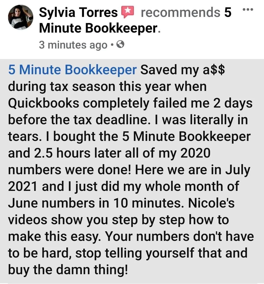 The 5-min bookkeeper is amazing. For the first time in 16+ years of business not only am I doing my own bookkeeping (in a few minutes a day), but I'm afraid to say I might even be enjoying it, lol!